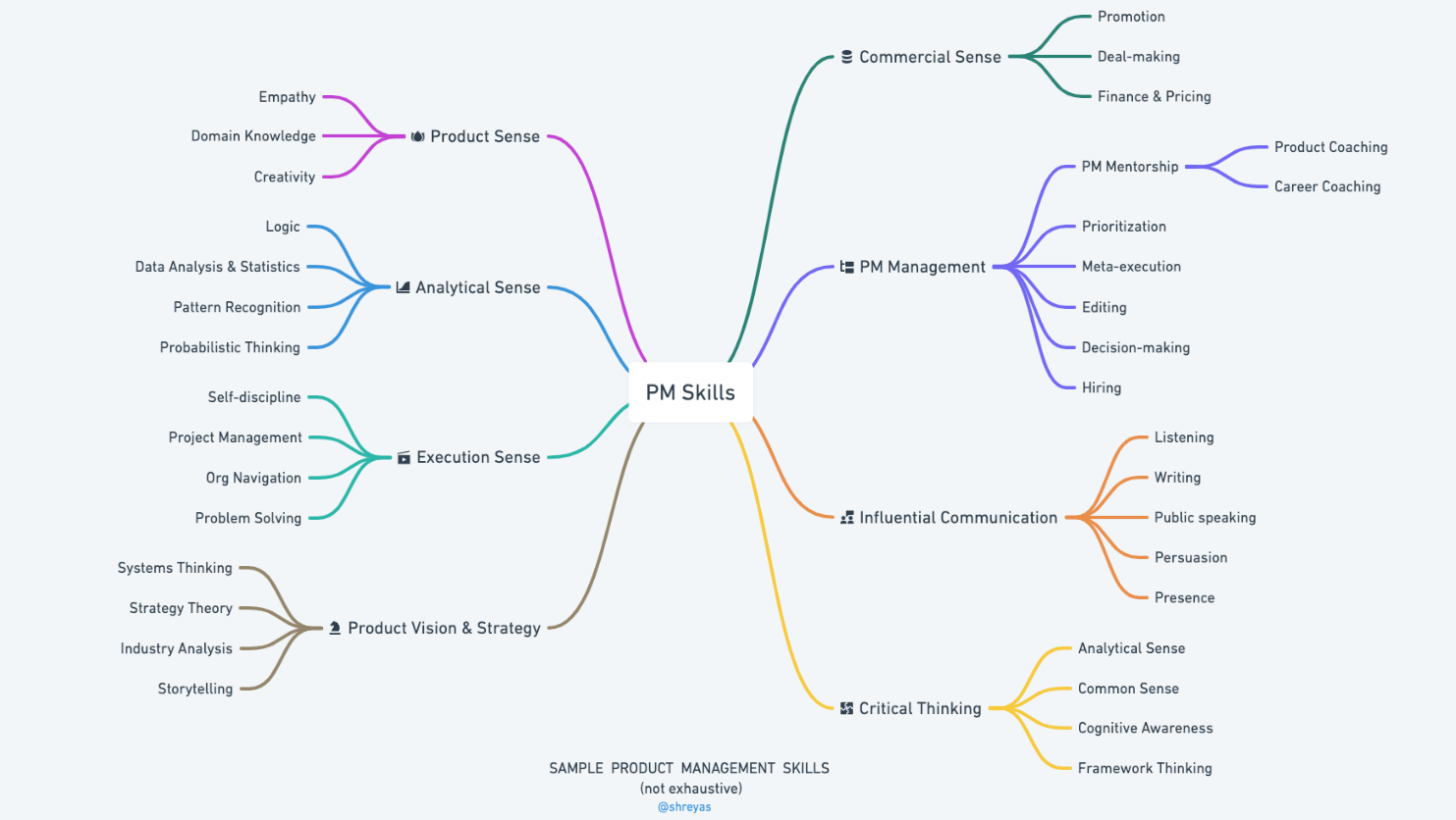 Centering your product management work around a mindset and a process keeps the important questions at the forefront and protects you from getting lost in the dizzying number of tactical skills a PM should be developing over time — customer research, prioritization, analytics, etc. Shreyas Doshi, one of my favorite twitter follows, put together this fantastic skills map that is based in a similar holistic approach:
