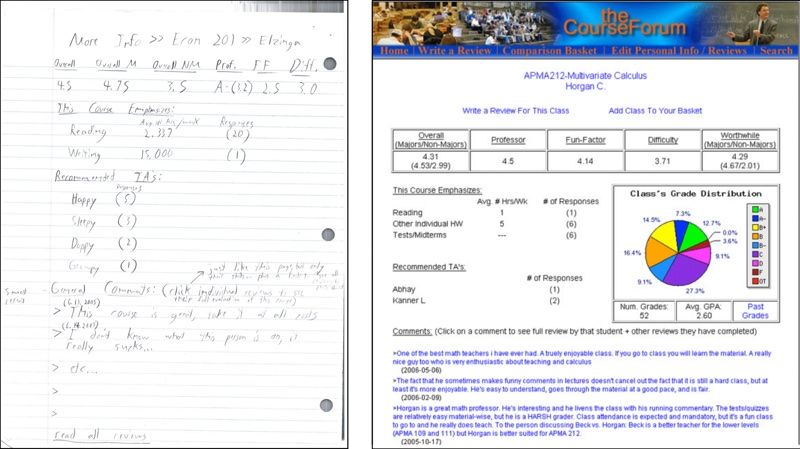 Since proper sleep is hard to come by on a night train, we talked instead, and our conversation meandered towards something that had bothered us the previous semester: the way our friends figured out what classes to take, or, more often, the way they didn't. We were especially bothered by the way that some students seemed to have access to privileged silos of information about what classes and professors to take (such as in fraternities and honor societies), and others didn't.